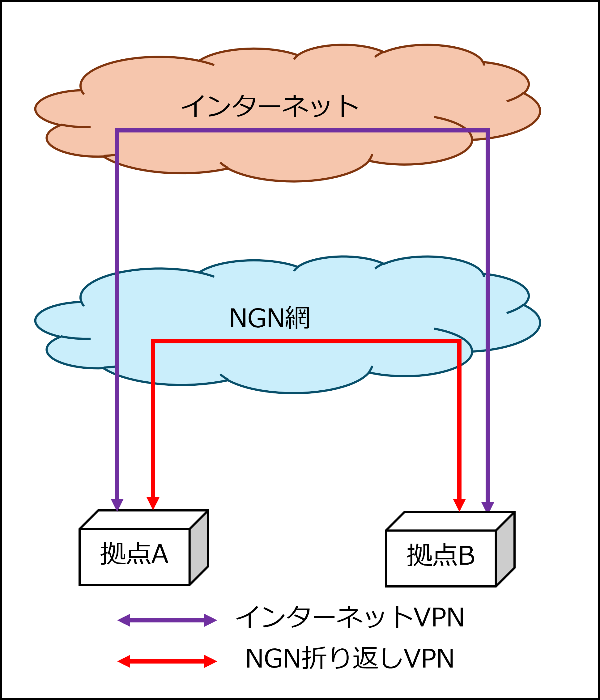 この特徴を利用し、NGN網内に閉じたVPN (NGN折り返しVPN) を張ることで、インターネットを経由しない低遅延の拠点間通信が可能となります[2]。仕組み上ベストエフォートであることに変わりはありませんが、インターネットに抜ける必要がないため、速度的にも非常に有利です。一般に専用線や閉域VPNは非常に高価であるため、インターネットVPNと閉域網系サービスの中間として大いに利用価値のある方式だと思います。
